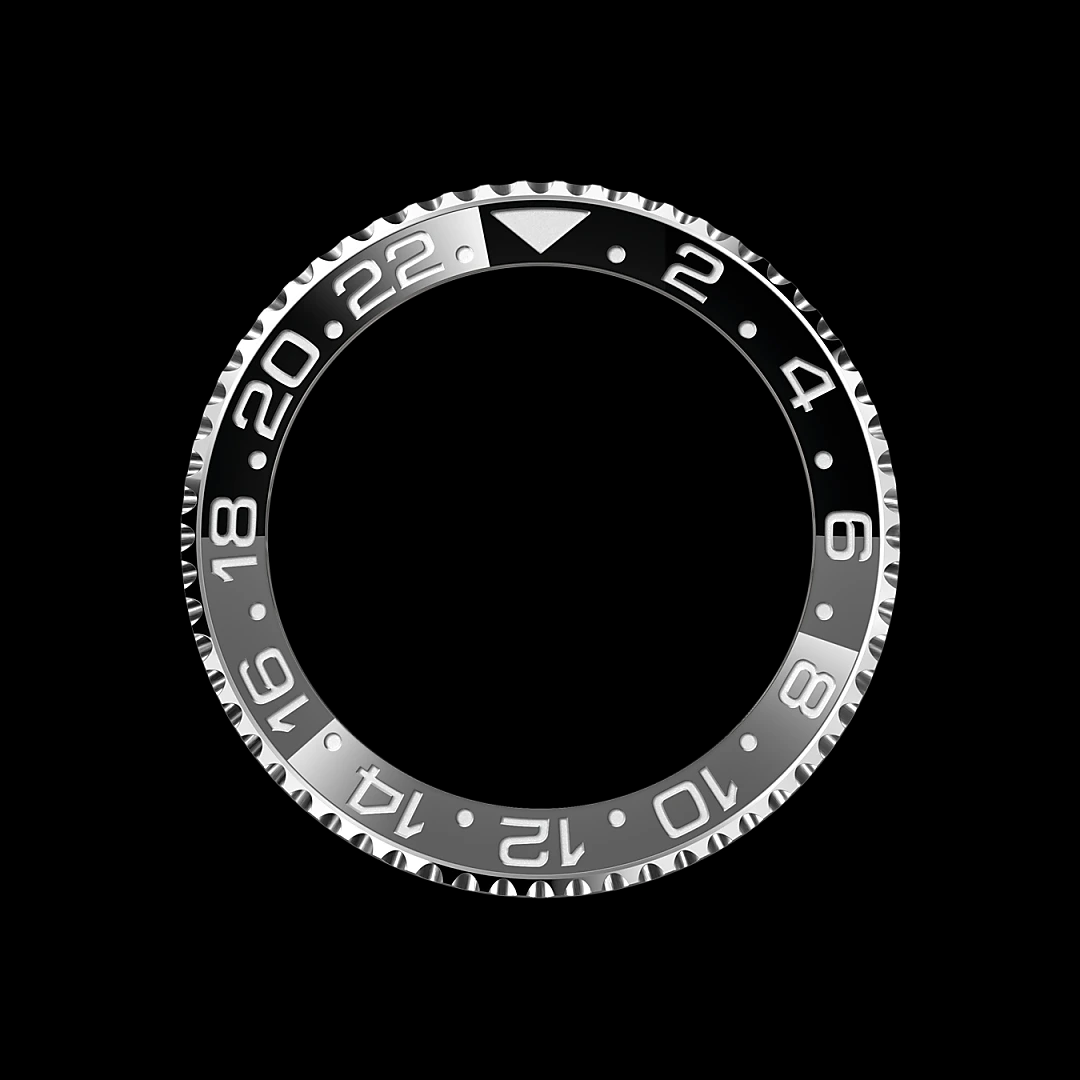 - 両方向回転式、24時間目盛り入り。グレー/ブラックのセラミック製セラクロムベゼルインサート、数字と目盛り入り