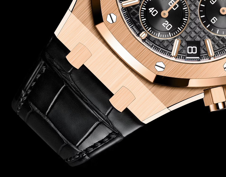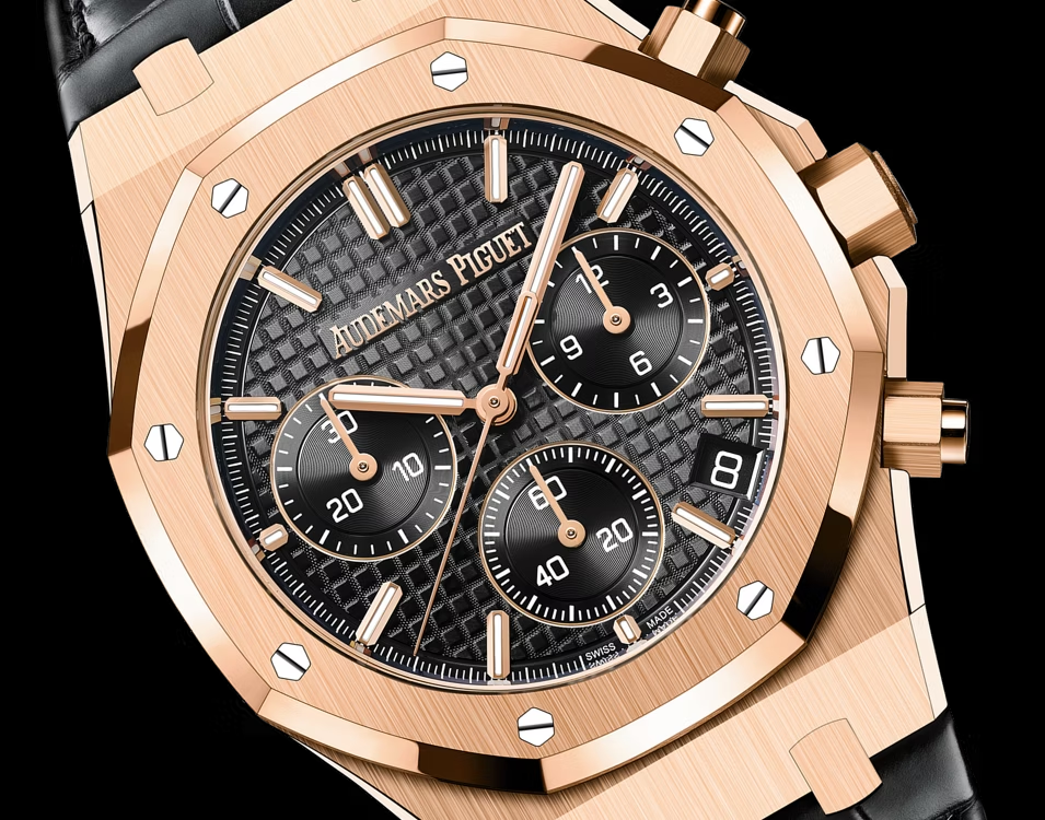 18Kピンクゴールド、41ミリのケースはブラックの「グランドタペストリー」ダイヤルとアリゲーターストラップを組み合わせています。このクロノグラフはロイヤル オークの進化した最新のデザインを取り入れています。