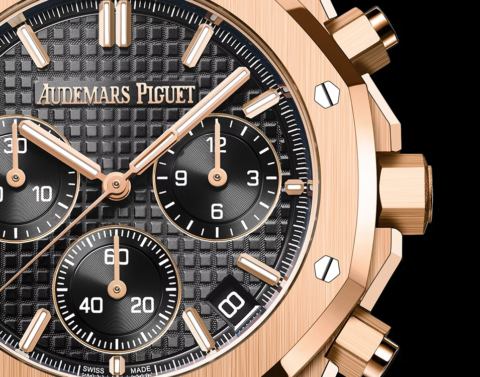 「グランドタペストリー」模様のブラックダイヤル、ブラックカウンター、蓄光処理を施したピンクゴールドのアプライドアワーマーカーとロイヤルオーク針。