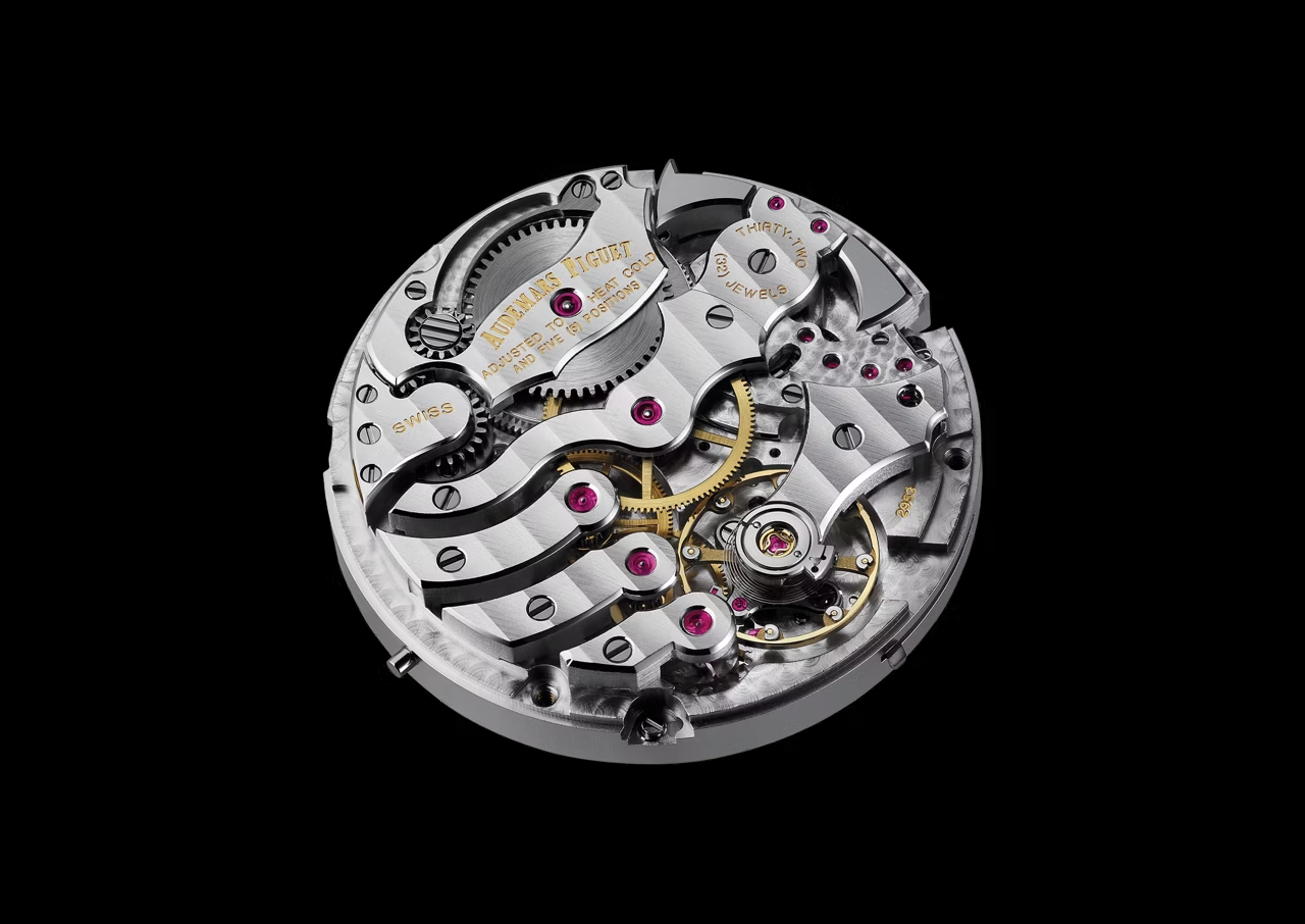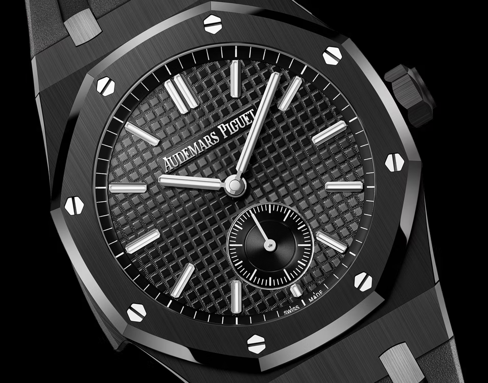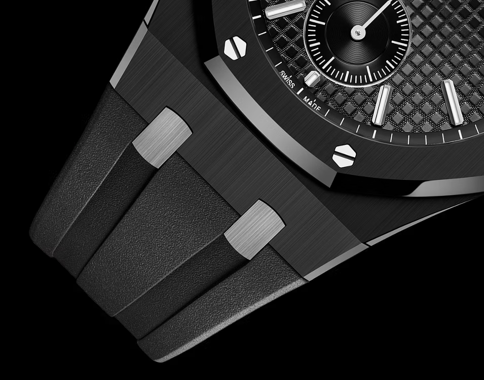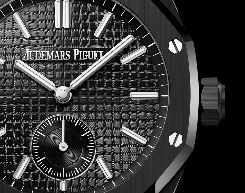 マニュファクチュールのソヌリに関する深い造詣を集約させたこのロイヤル オーク ミニッツリピーター スーパーソヌリはブラックセラミック ケースとブラックの「グランドタペストリー」ダイヤルを組み合わせています。
