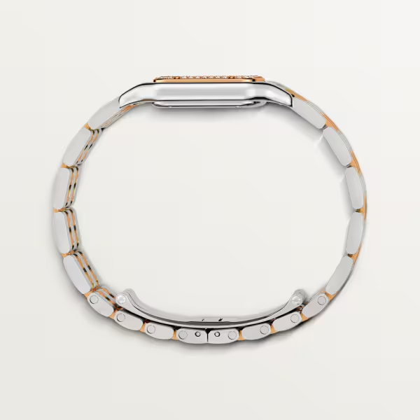 パンテール ドゥ カルティエ ウォッチ、SM、クォーツムーブメント。ピンクゴールド750/1000&スティール製ケース、ベゼルにブリリアントカット ダイヤモンド36個(0.24ct)。サイズ:22mm x 30mm、厚さ:6mm、リューズにブルー シンセティックスピネル、シルバー仕上げダイアル、ブルースティール製剣型針、ピンクゴールド750/1000&スティール製ブレスレット、日常生活防水。